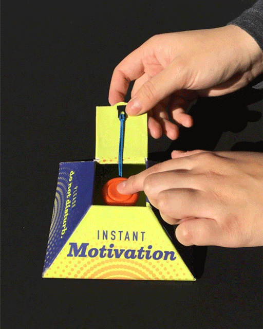 For this assignment, I was asked to create packaging for something that was absent from my life. At the beginning of my senior year, that was motivation. Rather than designing a “magic bullet” product, I wanted to create a package that actually evoked the experience of trying to get motivated. I rigged an elastic band to the box’s lid so when you first try to open it, there’s some unexpected resistance. And if you let go or get distracted for even a second, the box snaps shut—and you’re back at square one, in need of motivation.