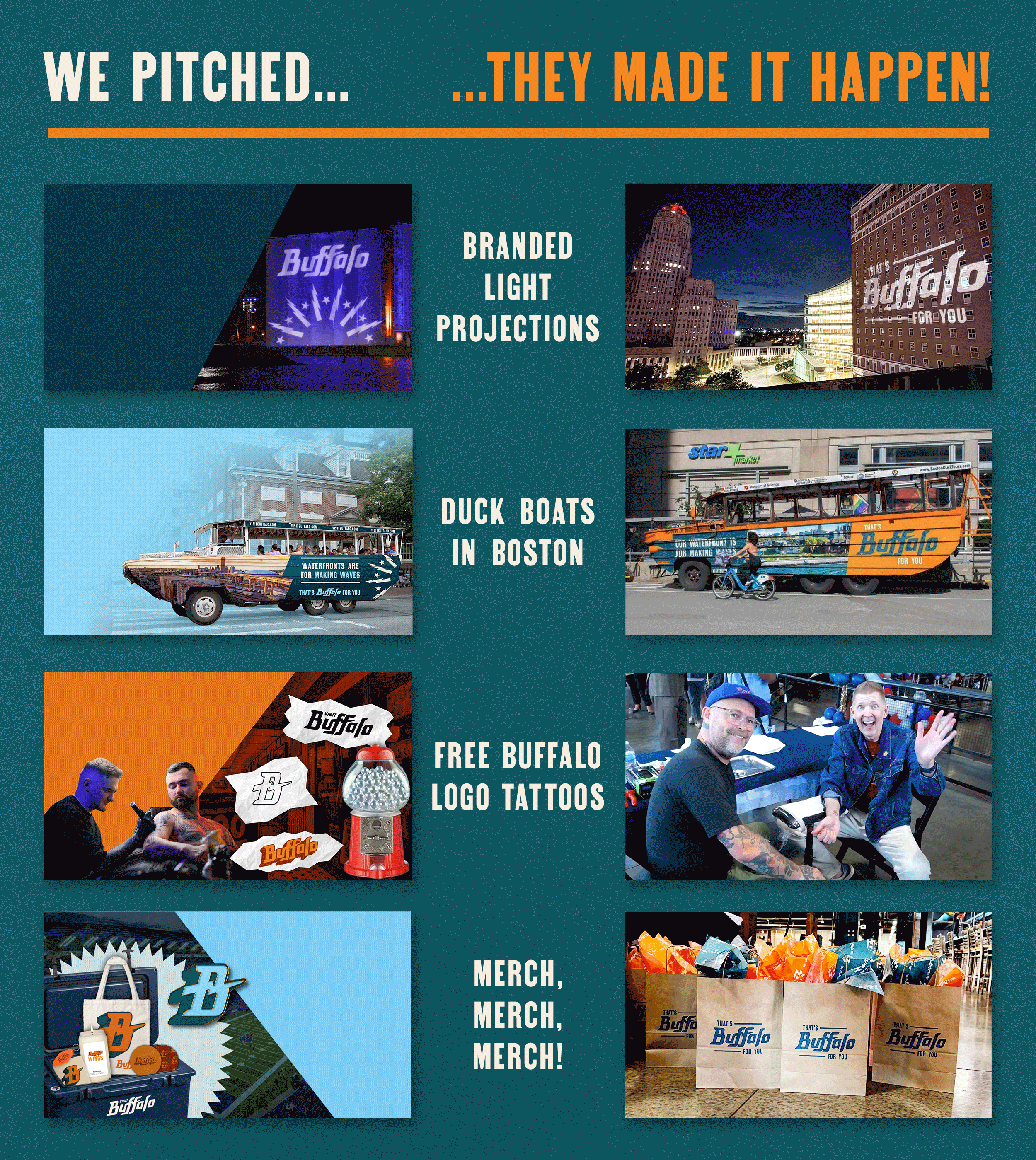 Seeing this campaign launch was one of the most fun experiences of my advertising career—the team at Visit Buffalo were such receptive partners in bringing these ideas to life. One of my favorite examples: As we pitched ideas for the brand rollout, we talked about how proud Buffalonians could wear the new logo. We joked, "Let's sell temporary tattoos in a mini vending machine for a few bucks—or, you can get a real tattoo for free!" And what happened? At the brand launch event, SIX PEOPLE got inked with the new Buffalo logo. (And countless more took us up on the temporary tattoos.)